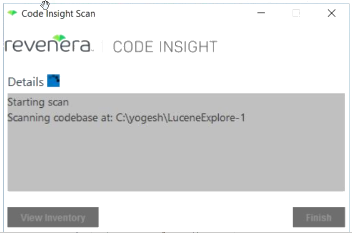 - Click View Inventory to connect to Code Insight, which opens to the Project Inventory tab for the project created for the scan. From here you can review, manage, and remediate the inventory resulting from the scan. For further instructions, refer to “Reviewing Published Inventory” in the “Using Code Insight” chapter in the Code Insight User Guide.