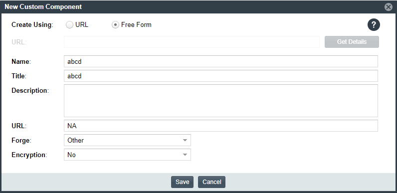in the upper part of the window for examples of the standard name, title, and URL conventions used by the Forge value you select.) If you do not know the URL, enter NA. For more information about these fields, see Custom Component Properties.