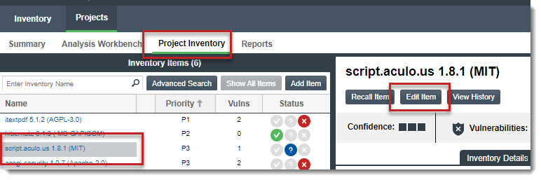 Click the Edit Item button in the header of the Project Inventory Details pane.