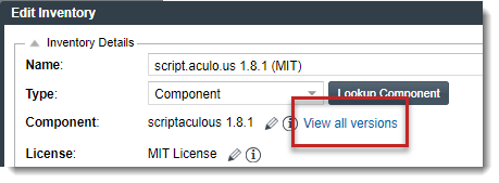 In the Edit Inventory window for the inventory item, locate the Component field and, next to the item’s component name and version, click View all versions.
