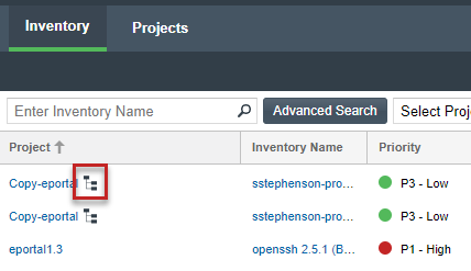 In the entry for each inventory item of a child project, the hierarchy icon is displayed next to the project link in the Project column.