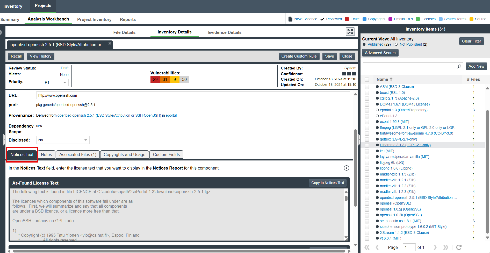 If the Notices Text field is empty, the As-Found License Text content is copied to the Notices Text field, with the formatting preserved.